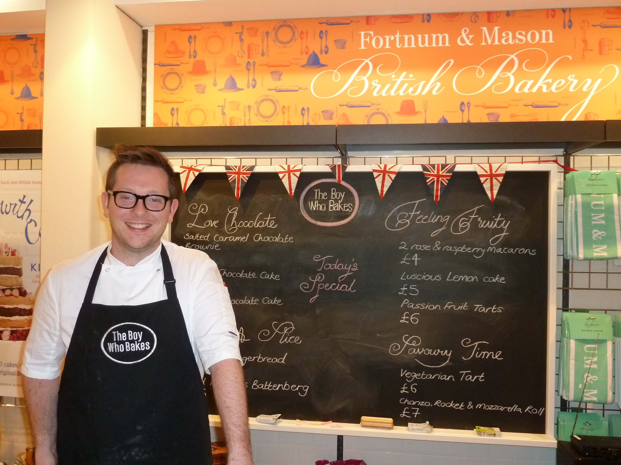 Fortnum and Mason are currently hosting a pop-up bakery, with famous bakers rotating every two weeks. Currently holding fort is Edd Kimber, AKA The Boy Who Bakes. He was the winner of The Great British Bake-Off in 2010 and has since released two cookbooks, in between various appearances on TV, and in magazines and newspapers. He’s baking all kinds of sweet treats, from flourless chocolate cakes to Battenberg cakes, from lemon cakes to passion fruit tarts.