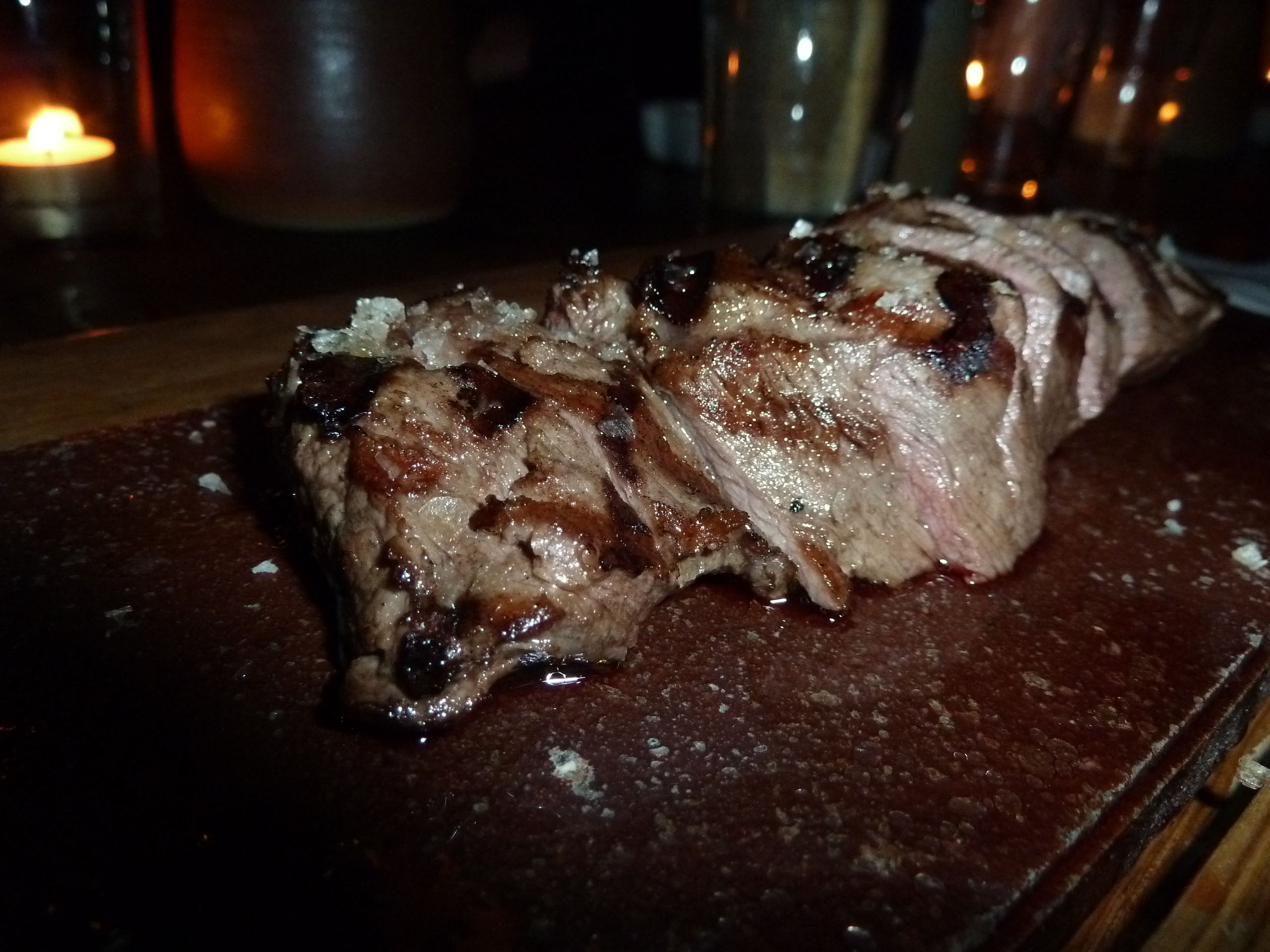 Then we ordered – surprise surprise – the flatiron steak for a tenner, which came with a salad. (I did a bit of geeky research – a flatiron steak is meat taken from the shoulder of the cow, cut in two to remove a touch connective tissues that runs through it. Read more about it here.)