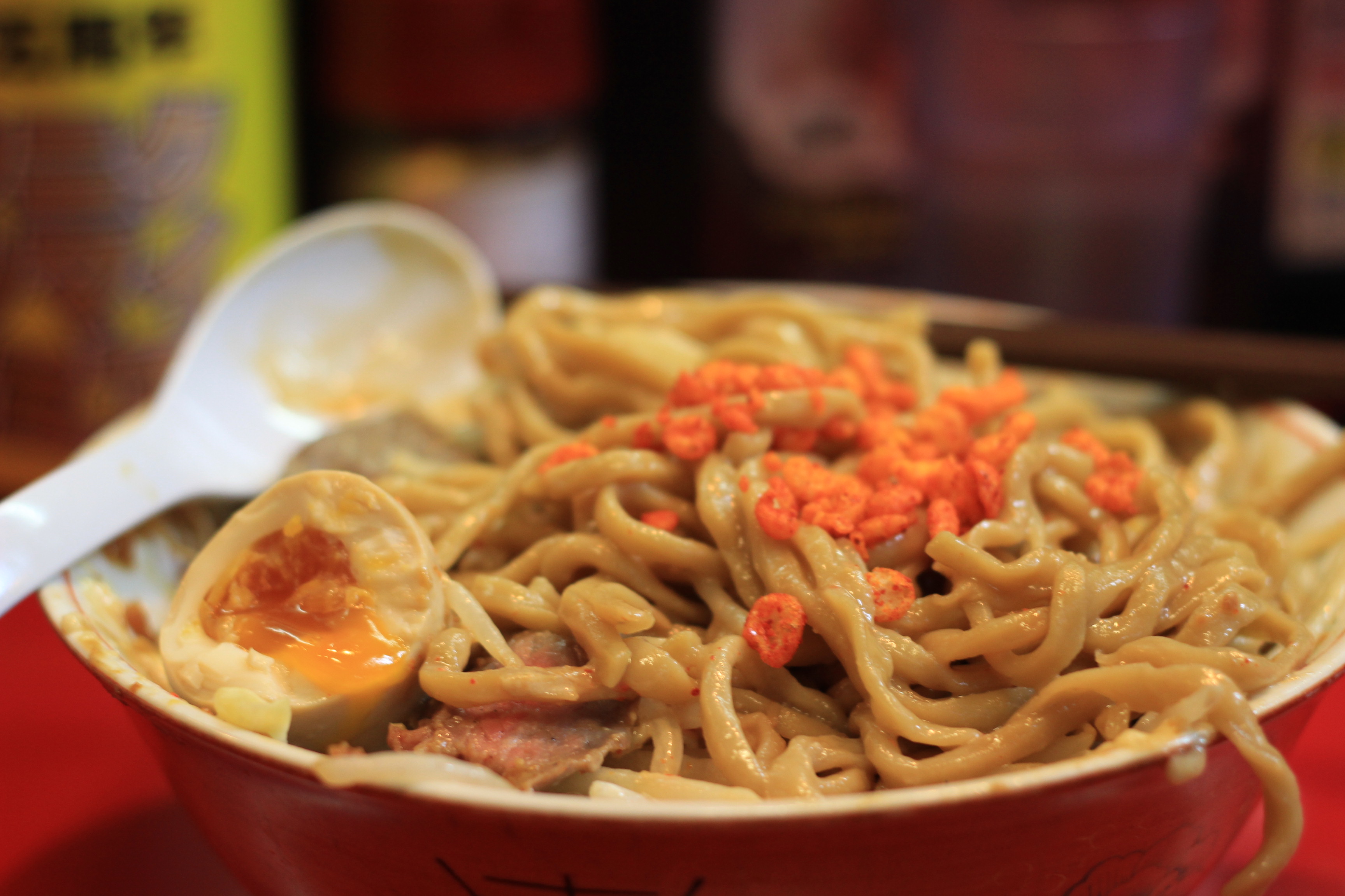 As the big size was free, we naturally said YES PLEASE and I also paid an extra 100 yen for a soft-boiled egg. Because… Well, because I like eggs and I’m greedy. Also, when they ask about toppings, if you want to try them all, make sure you say ‘zenbu de’ (with everything) or you’ll end up spying things and asking them to add them piecemeal.
